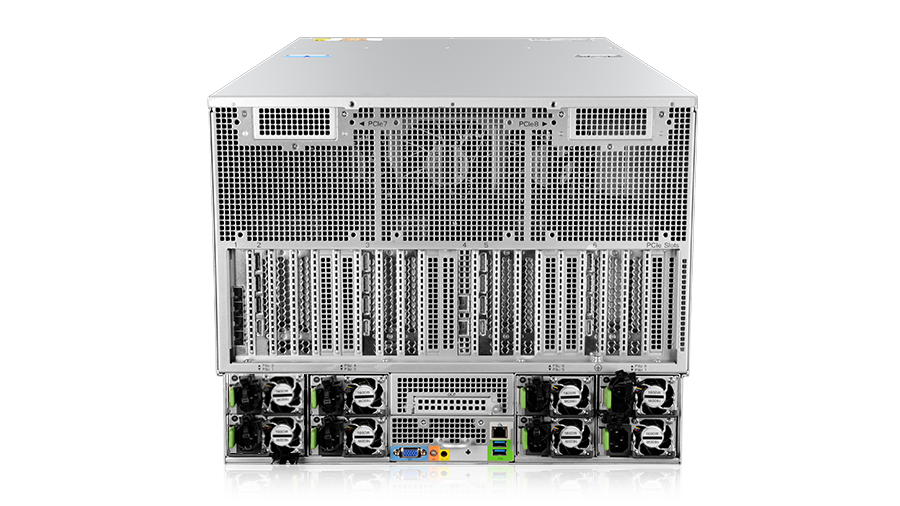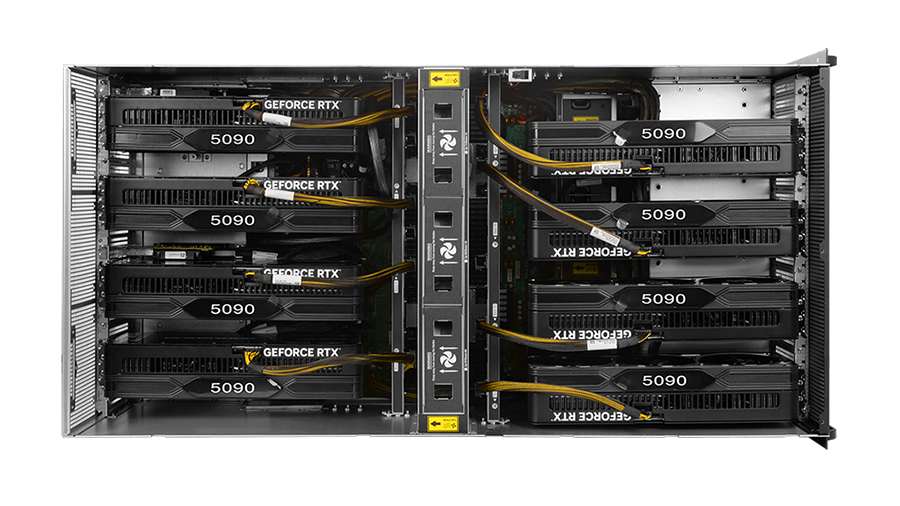 | GPU卡 | 直通8卡服务器风扇版:支持 8 张 600W 3 宽、3.3 宽、3.5 宽、4.5 宽 RTX 5090 风扇卡或其他600W 风扇卡 GPU, GPU 采用前后4+4 分离上下分风道布局 直通8卡服务器涡轮版:支持 8 张 600W 2 宽、2.5 宽 RTX 5090涡轮卡或其他 600W 涡轮卡 GPU,GPU采用 8 卡后置并排集中风道散热布局 |